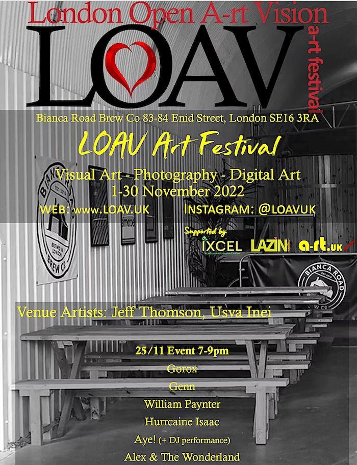 Pleased to announce the date and location for my next performance supporting Aye! as part of "London Open Art Vision Festival" has been confirmed. The date is Friday 25th November at Bianca Road Brewery Co, 83-84 Enid Street in Bermondsey. The venue is open from 3pm to view the exhibition, and live acts begin from 7pm. The event is free and -as you may have noticed- is in a brewery! So, what more reason to pop in, grab a pint and enjoy the show!
