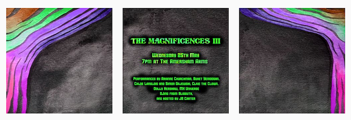 Greetings! I was delighted to have been involved in the fabulous "The Magnificences" last month at the Take Courage Gallery in New Cross. I DJ'd and assisted the performer's with audio soundtracks. A minor role, but very very enjoyable, I had a wonderful night watching some splendid performances.