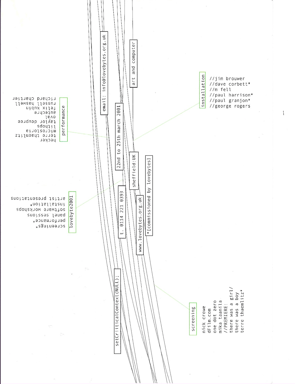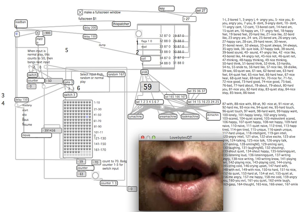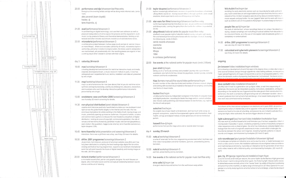 Commissioned by Lovebytes Digital Arts Festival and continuously projected in Sheffields Showroom Cinema screen throughout the festival. Inspired by the ‘Cut Up’ literary technique, this is a ‘generative permutating cut up’ film created in Max/Msp & Nato. The film cuts to predetermined frames in the timeline, based upon either probability or random values. Featuring Artist Espen Jensen.